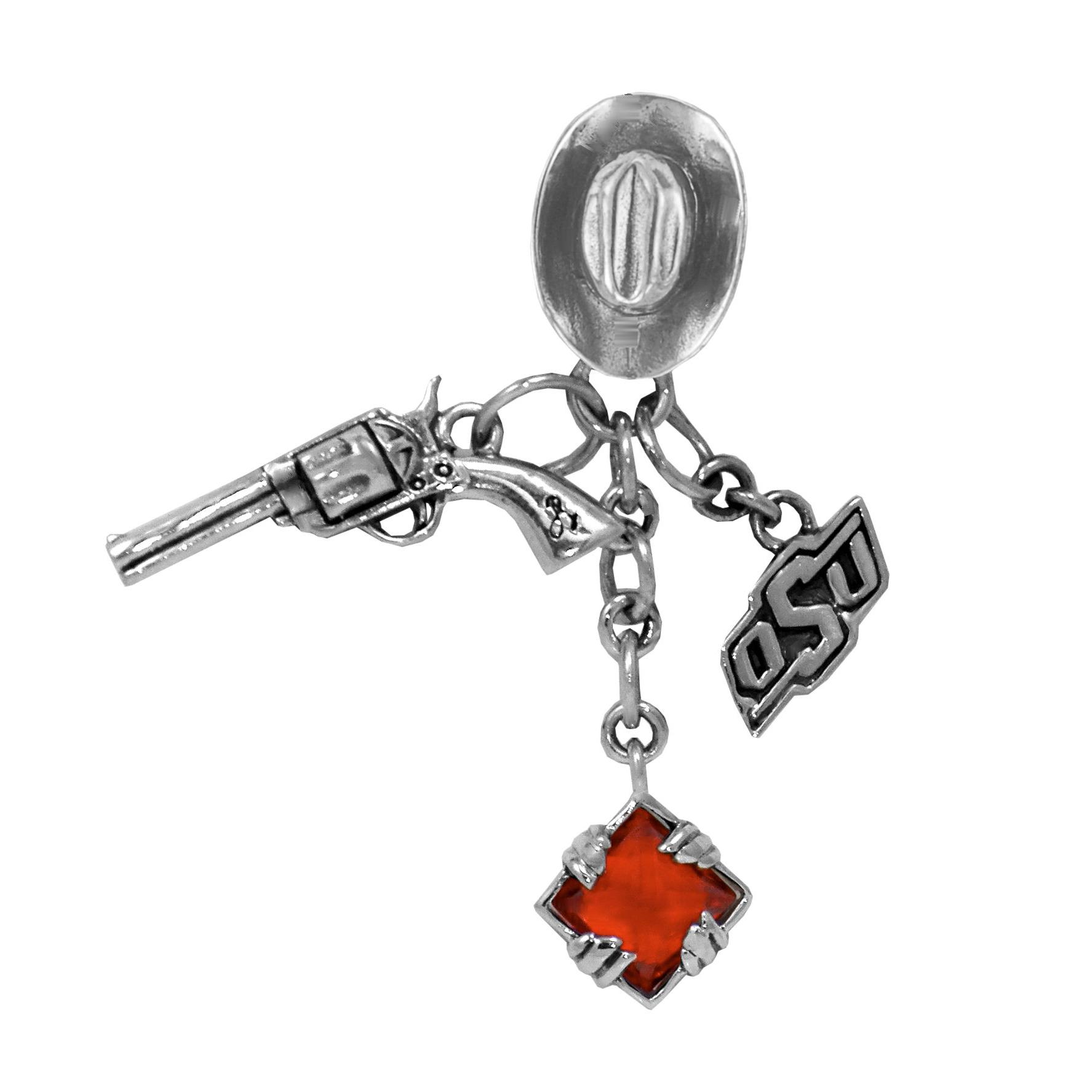 Sterling silver Oklahoma State University pendant with dangling pistol, 8 mm orange CZ, and "OSU" logo. Bail is hidden behind hat.