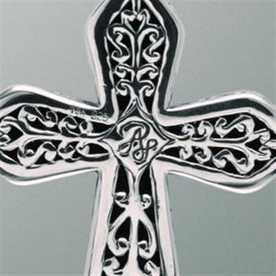 Sterling silver cross pendant with 18K gold bezel around gemstone.