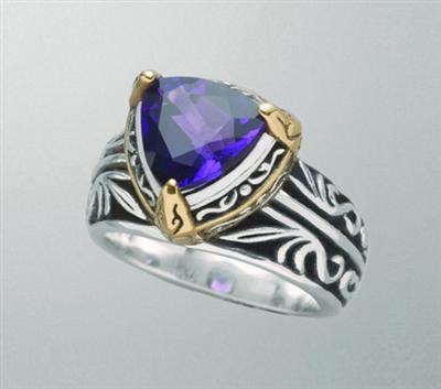 Sterling silver ring with 18K gold accents and trillion gemstone.
